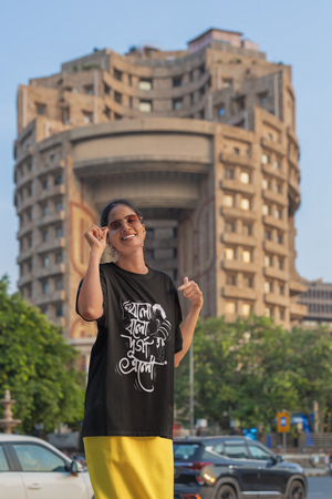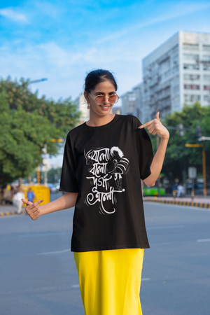 Women's Black Durga Puja Special Bolo Bolo Durga Elo Printed Oversized T-Shirt